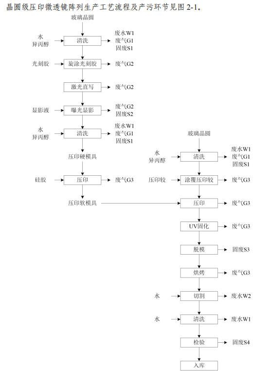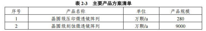 本项目总投资金额为12,229.03万元,无新增厂房建设,改造装修公司现有厂房(包括超净房建设等);引进购置一批:激光切割机、微透镜纳米压印机、光栅纳米压印机、刀轮切割机、AOI检测设备、等离子干法刻蚀机等设备60台(套),将光学玻璃、硅透镜等原材料采用半导体技术、纳米压印、刻蚀技术即涂覆压印胶,模具校准,对准与压印,紫外固化、脱模、去胶、镀膜、切割、检测测试等先进半导体光学加工工艺量产,最终得到产品晶圆级压印微透镜阵列和晶圆级刻蚀微透镜阵列,实现微纳光学元器件相关产品技术迭代与创新升级,最终形成年产晶圆级压印微透镜阵列280万颗、晶圆级刻蚀微透镜阵列9000万颗。