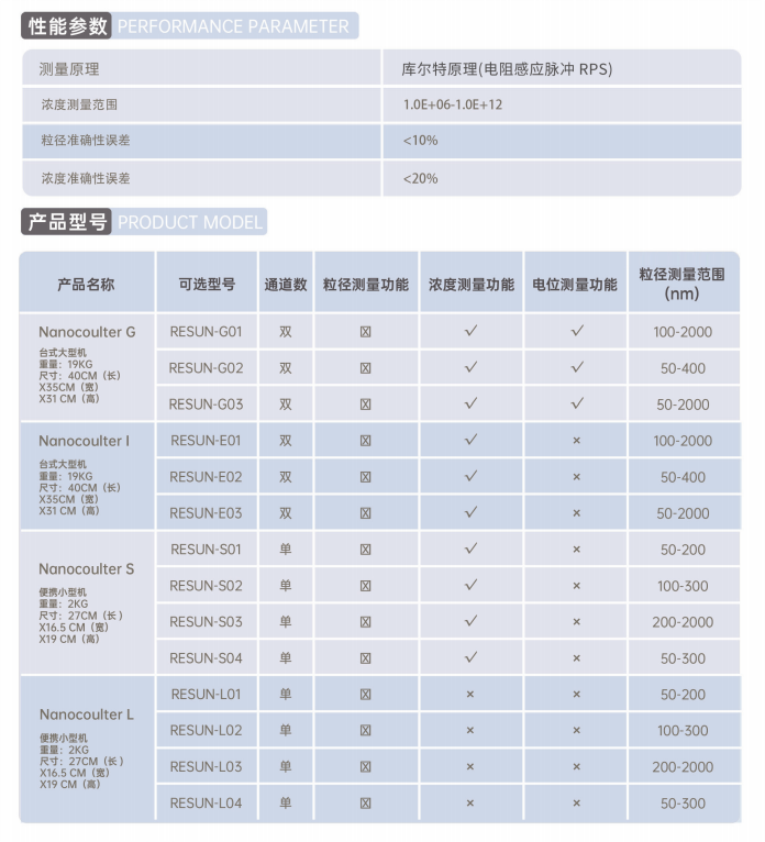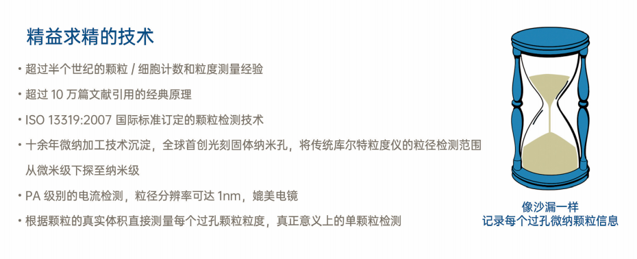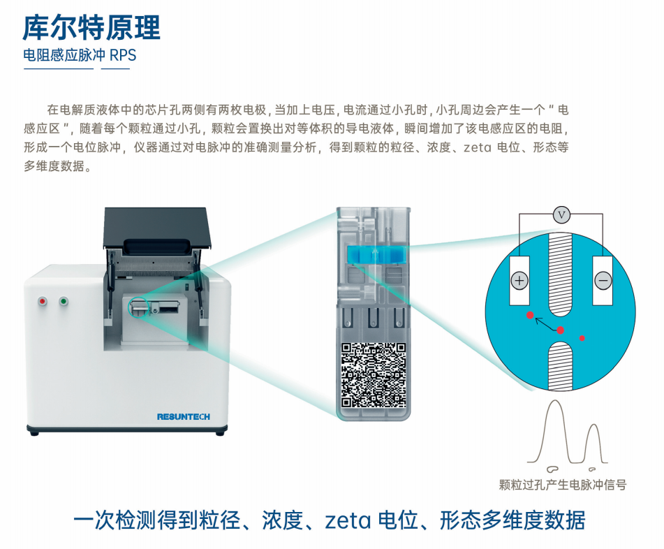 瑞芯智造(深圳)科技有限公司在此基础上开发的纳米库尔特粒度仪,全球首创固体纳米孔颗粒分析平台,绕开传统光学检测方法的弊端(大颗粒遮挡小颗粒散射光;样本折射率、吸光度、黏度影响测试结果),采用新一代电学检测方法,将传统的库尔特计数仪的粒径检测下限从微米级下探到50nm,粒径分辨率可达1nm,实现纳米颗粒单颗粒检测,一次测试得到多维度数据(粒径、浓度、zeta电位、形态),在科学研究、生产品控、工艺控制、临床诊断、医药研发等需要高精度纳米颗粒检测的场景,提供精准的数据,带您走进精彩纷呈的纳米世界。