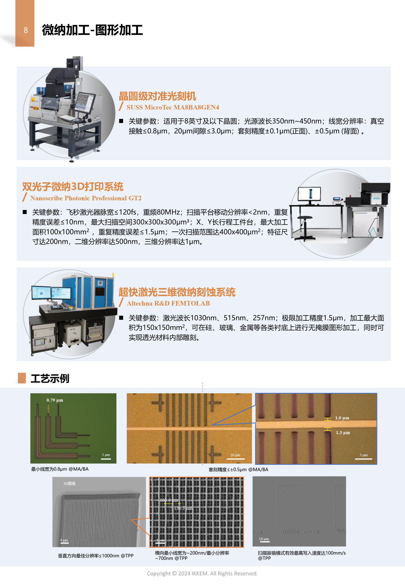 双光子光刻制备微透镜阵列 实验室工程师利用微纳加工平台双光子光刻系统(Nanoscribe Photonic Professional GT2),通过合理选择写头、调整曝光时间等参数,成功在衬底上制备球面半径20μm的微透镜结构阵列,其制备工艺相较传统光刻技术缩短了3倍流程时间。该技术的开发为平面二元光学器件(如超表面全息元件、光束整形器件)的小批量化制备提供了新方案,使平台加工能力从传统微电子领域延伸至光子集成电路、AR/VR光学模组等新兴领域。