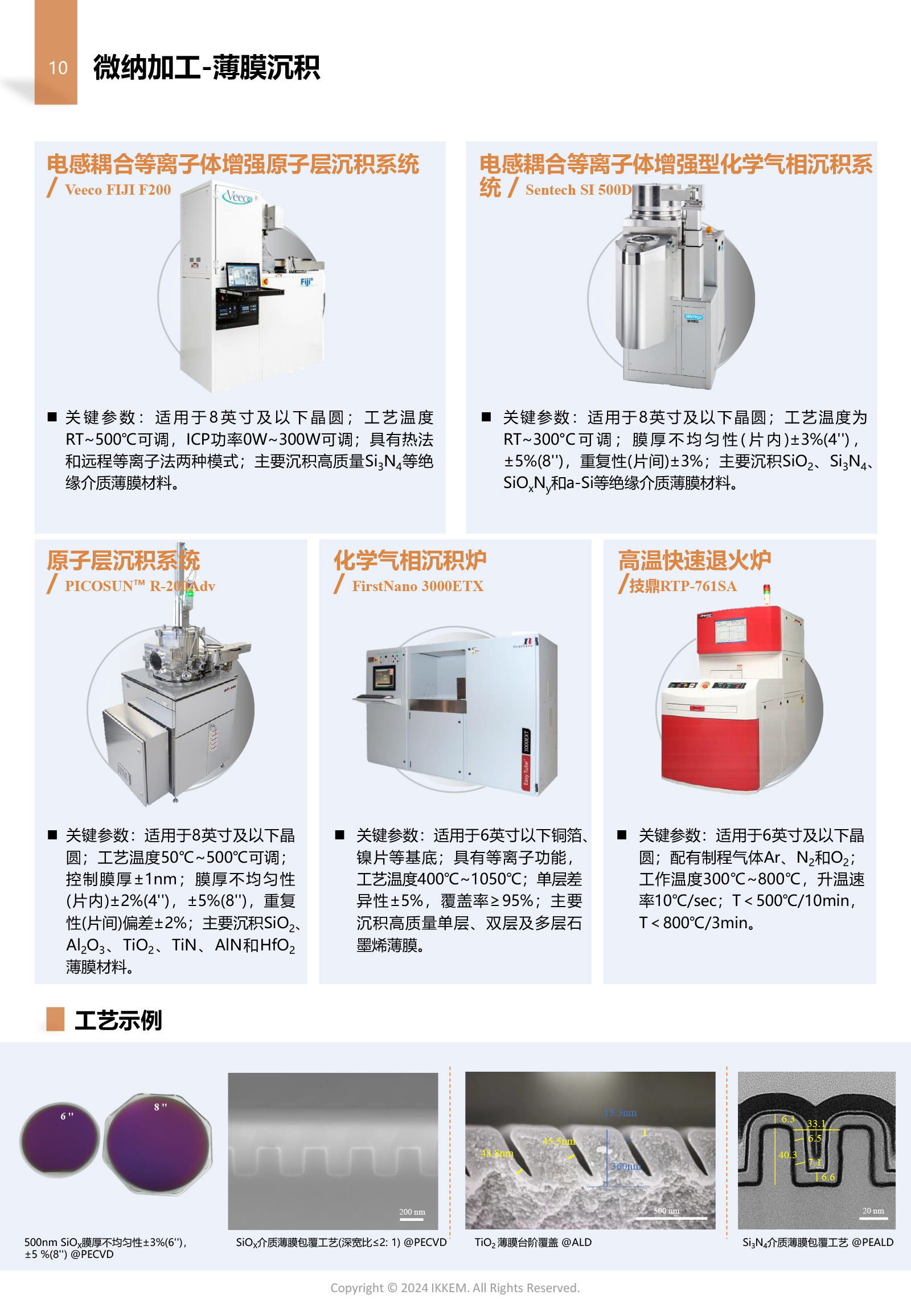 超厚材料制备 超厚(30μm级)二氧化硅薄膜在常规半导体器件中较为罕见,但在一些特殊应用场景中利用其高绝缘性、化学稳定性、机械支撑能力和三维结构填充能力具有独特价值。实验室工程师针对目前电感耦合等离子体增强型化学气相沉积系统(PECVD)超厚材料生长工艺进行了相应的技术能力开发,通过分段沉积、多次调节样品沉积角度、脉冲时间等参数,成功在8英寸晶圆上实现厚度为30μm、均匀性<5%的二氧化硅薄膜材料。日后可更好服务MEMS芯片、光电子与集成光学领域。