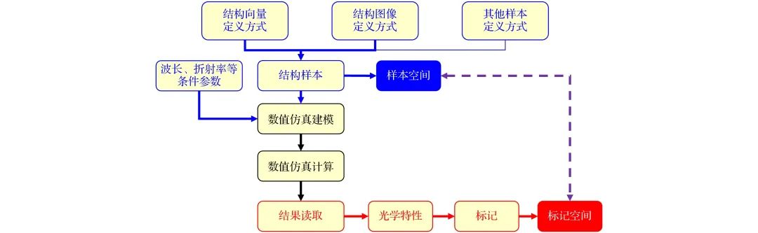 数据集的构建过程如 图3 所示, 首先将结构参数向量、像素图像及图像数据等结构样本构建为样本空间, 结构样本与波长、折射率等条件参数通过数值仿真建模、计算的方式计算出相应的光学特性, 通过标记的方法构建标记空间. 下面对结构向量、结构图像的样本如何构建, 结合典型应用案例进行论述.