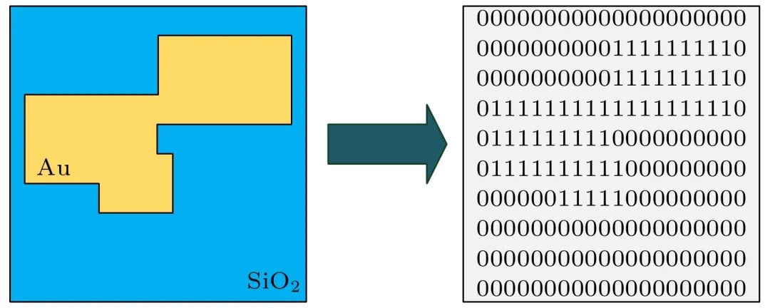 Li等 [ 46 ] 利用贝叶斯优化和卷积神经网络的自洽框架(Bayesian optimization (BO) and convolutional neural network (CNN), BoNet), 来计算和优化金属纳米结构的光学特性. 通过将尺寸为10 nm×10 nm×40 nm, 位置在Si/Sio 2 上方的Au纳米天线进行编码处理, 如 图9 所示, 将Au所在的区域编码为1, 空区域编码为0, 通过FDTD的方式对具有边界条件的麦克斯韦方程进行求解, 计算出相对应的反射光谱和电场分布. 将编码过的金属纳米结构图像作为BoNet的输入, 相对应的反射光谱和电场分布作为输出, 通过训练该网络结构即可实现对光学手性特性的预测, 获得完美的光学手性.