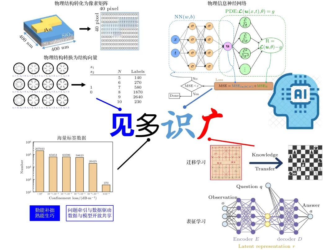 从简单的平板波导结构, 到反谐振光纤、光耦合器、光分束器设计及钙钛矿太阳能电池、超表面、超材料设计. AI在微纳光学中的应用愈发广泛. 每一次AI在微纳光学领域中的应用都带来了新的启发, 并为相应微纳结构或者光学器件的设计带来新的思路. 如图13所示, 用“见”、“多”、“识”、“广”四个方面来对AI在微纳光学设计中的应用进行总结与展望.