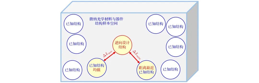 在基于AI的光学设计过程中, 相同物理规律指导下的光学设计往往产生相似的结构设计, 通过最近向量距离(ΔLmin)和均值向量距离(ΔLave)2个参数定量描述逆向设计结果的奇异性, 可以表征设计结果对微纳光学材料与器件的结构样本空间研究、获得新知识与新设计方法的启发性. ΔLmin与ΔLave分别定义为光学设计样本空间中设计目标与最近已知结构样本位置与现有已知结构样本位置均值之间的距离, 如图14所示.