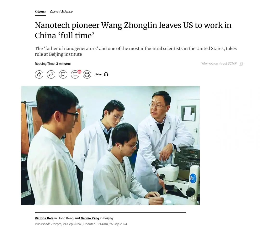 王中林是纳米能源研究领域的奠基人,他在美国佐治亚理工学院材料科学与工程学院工作了近30年,在该学院的个人主页上写着,王中林“以其出色的创造力和生产力被视为全球纳米科学和纳米技术领域的先驱和领导者”,他在科研上最突出的贡献纳米发电机和自供电传感器,为无需电池即可自供电的无线设备开辟了技术潜力。