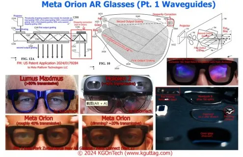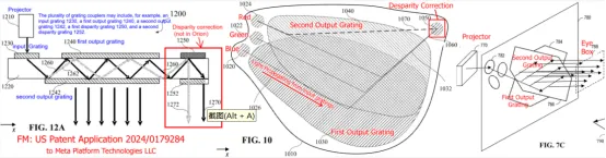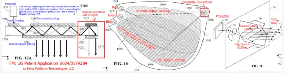 阿克塞尔·黄对Meta Orion波导的分析在Reddit上被翻译并发布为《Meta Orion AR眼镜:光学架构的首次深入研究》,这为我对Meta Orion光学的研究提供了起点,我在很大程度上同意他的发现。根据他展示的图表,他的分析基于Meta Platforms(Meta的专利持有公司)的美国专利申请2024/0179284。下面展示了该申请中的三个图表。