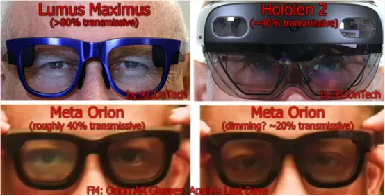 由于我是在无法控制光照的情况下判断视频和图片,因此无法确切知道光透过率,但可以与其他AR眼镜进行比较。以下是高透光率的Lumus Maximus眼镜,其透过率超过80%,而Hololens 2约为40%,与Orion眼镜的两个变暗水平相比。