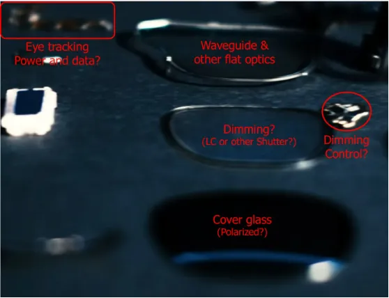 以下是Meta视频中的一个静态画面,展示了Orion眼镜的一些个别部分。它们似乎展示了异常黑暗的覆盖玻璃,一个带有驱动电路的变暗快门(可能是液晶)和一堆与波导连接的平面光学元件。在他的视频中,诺姆·陈表示:“我的理解是最前面的层可以像极化层。”这似乎与看起来黑暗的覆盖“玻璃”(可能是塑料)一致,相比之下,变暗快门(液晶几乎是透明的,因为它只是改变光的极化)。