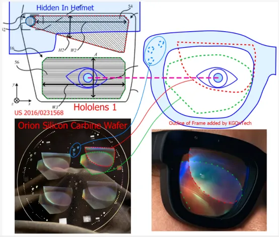 正如亚历克斯·黄在他的分析中指出的那样,支持如此宽广的视场角在眼镜形态中需要两个大光栅重叠。下方(左上角)展示了Hololens 1波导,这是大多数其他衍射波导的典型结构。它由一个小的输入光栅、一个(通常是)梯形扩展光栅以及一个更矩形的第二个扩展和输出/退出光栅组成。在Orion(右上角)中,两个较大的光栅有效重叠,使波导适应眼镜的形态。我大致将Hololens 1和Orion的波导定位在与眼睛的相同垂直位置。