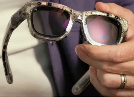 Meta的Bosworth在《我尝试过的最疯狂的科技——Meta Orion》中提到:“因此,这个堆叠[指向透明塑料原型眼镜的角落]实际上会变得更薄,大约是原来的一半。因为投影仪是在那个点从后面进来的。”
