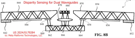 Meta的申请2024/0179284虽然展示了波导的许多其他细节,但主要涉及“差异校正”。Bosworth在几次采访中(包括这里)提到,Orion没有差异校正,但他们计划在未来的设计中加入。Bosworth描述说,差异校正旨在纠正框架的任何弯曲(或其他对齐问题),以免导致波导(及其相对于眼睛的图像)移动。他似乎暗示,这将使Meta能够使用更薄且可能具有一定弯曲的框架。