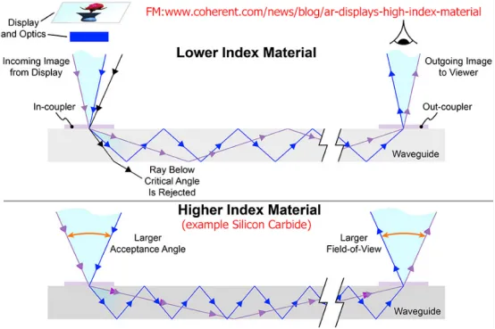 使用碳化硅作为波导的想法并非Meta独有。下面的图片来自《获取AR/VR中的大图》,讨论了使用高折射率材料(如铌酸锂和碳化硅)制造波导的优势。众所周知,使用更高折射率的基材可以支持更宽的视场,正如下面的图所示。然而,正如Bosworth所指出的,生长碳化硅晶圆的成本非常高。这些晶圆也小得多,使得每个晶圆上可制造的波导数量更少。从Meta的晶圆图片来看,它们每个晶圆仅能获得四个波导,而在更大且便宜的玻璃晶圆上,可以制造十个或更多的衍射波导。