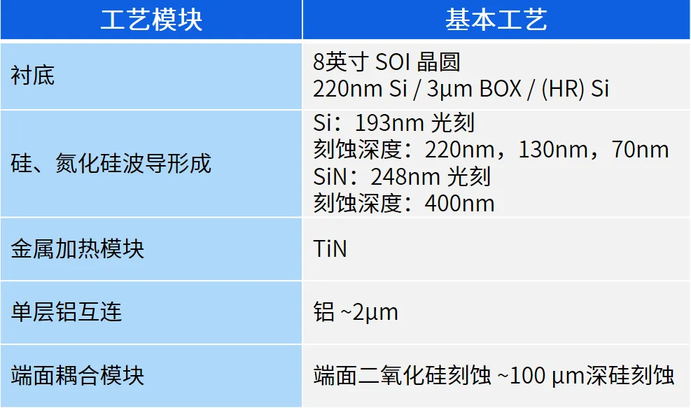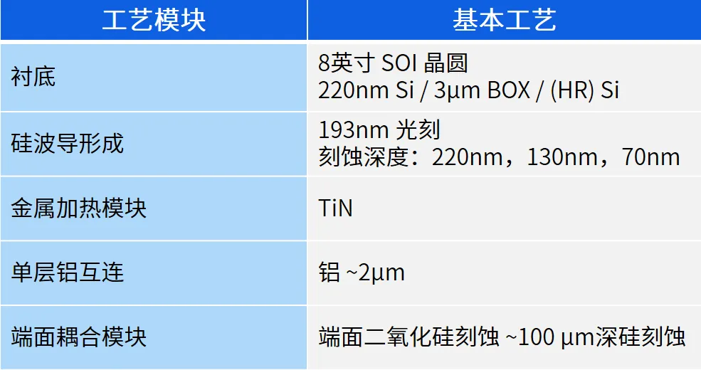 目前,SOI无源集成工艺流片的最小工艺节点为90nm,具备三步硅刻蚀、TiN金属加热电极、单层铝互连和深硅刻蚀等关键工艺能力,可实现各种高性能的硅光无源器件。