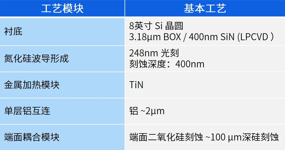 SiN集成工艺流片具备LPCVD氮化硅、TiN金属加热电极、单层铝互连和深硅刻蚀等关键工艺能力,可实现各种高性能氮化硅无源器件。