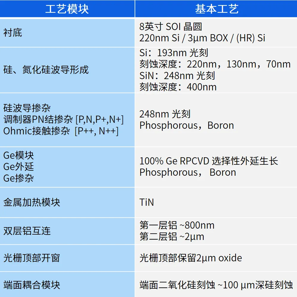 目前,90nm SOI有源工艺流片的最小工艺节点为90nm,具备三步硅刻蚀、多步有源器件掺杂、锗外延与TiN金属加热电极、双层铝互连和深硅刻蚀等关键工艺能力,可实现各种高性能的硅光无源、有源器件。