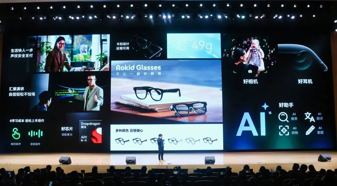 11月18日举办的这场发布会中,最令人瞩目的莫过于Rokid Glasses。当Rokid创始人Misa戴着这副与BOLON联名的新品走上舞台时,全场发出了惊叹声。这副仅有49克的AR眼镜,完全颠覆了人们对AR设备“傻大黑粗”的传统印象。"为了实现这个突破性的重量,我们的团队倾注了近两年的心血。"Misa回忆道,"仅镜架的结构设计,就经历了200多次迭代优化。每一克的减重背后,都凝聚着工程师们对极致的追求。"