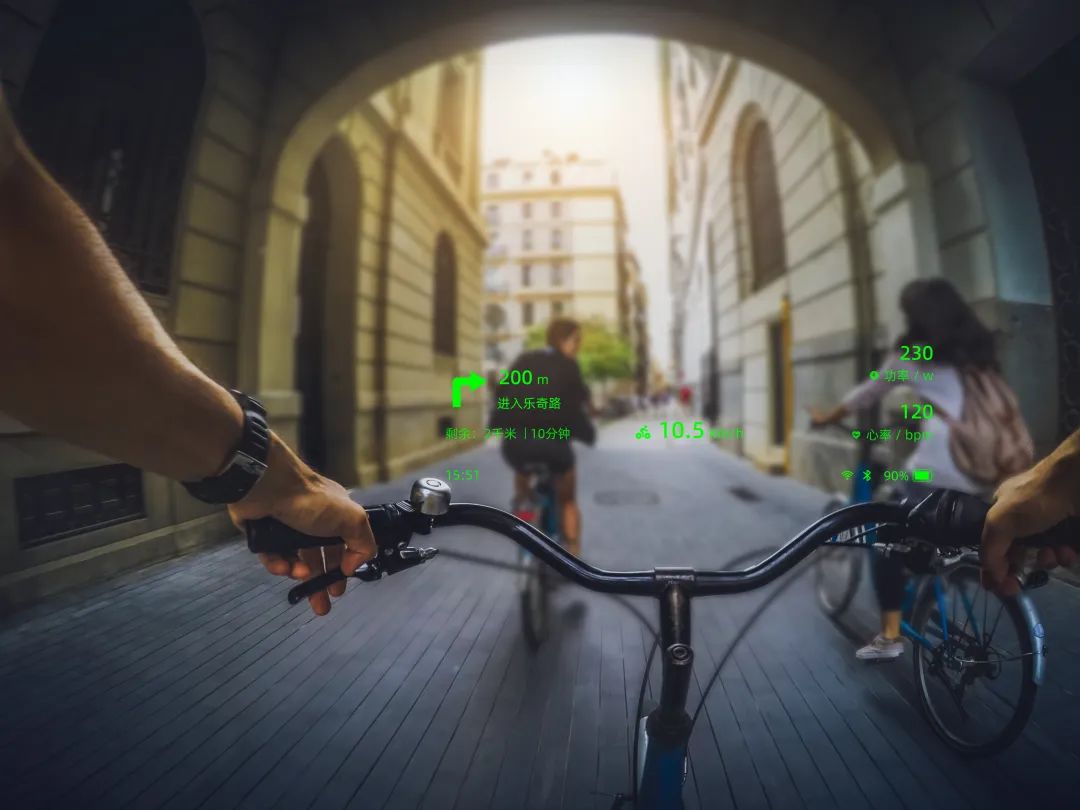 Rokid Glasses能够显示来自钉钉、微信等应用的消息提醒,以及天气、导航等实用信息。搭载的九轴IMU传感器确保了虚拟内容的稳定显示和精确的动作识别,特别是在运动或骑行场景下,实时导航显示和路况播报功能体现出极强的实用价值。