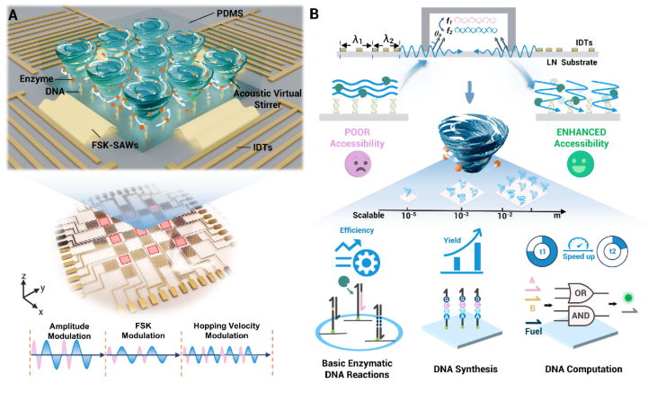 针对这一难题,本研究开发了一种微尺度声学虚拟搅拌子(AVS)技术,通过构建可规模化拓展的集成式微反应器件,实现芯片中多种反应流程的效率与产率提升。该AVS技术在铌酸锂基底设计声表面波单元阵列,每个单元均可通过声学信号控制产生驻波场,并且通过可编程信号调制使声势阱或压力节点以可控的频率与幅度进行周期震荡,产生虚拟的搅拌子效应。在震荡的声势阱中,流体在梯度声辐射力及声流效应的作用下进行震荡和混合。不同于传统技术,该平台无需物理微结构介入,通过场调控方式进行作用,并控制搅拌速度与振幅,能够在微观到宏观大面积多个尺度上实现精准流体扰动。此外,作者基于该平台构建了核酸微反应平台,结果显示AVS技术能够增强固定在表面DNA的构象与酶促DNA反应传质效率,使片上单碱基酶法DNA合成的逐步产率提升7.74%,逻辑门运算速度较自由扩散体系提高8.58倍,解决了固液界面DNA计算反应可及性差、效率低的问题。值得关注的是,AVS技术具有显著的可扩展性和易于集成优势,能够根据需求在多种尺度上拓展部署,并且实验中展示了多通道反应单元的集成芯片,证明了其在大规模并行反应中的潜力,为后续自动化、高通量核酸分析及并行化DNA计算奠定了坚实的基础。同时,该声学微反应器件也在分子诊断、生物工程、信息处理及合成生物学等领域展现出广阔应用前景。