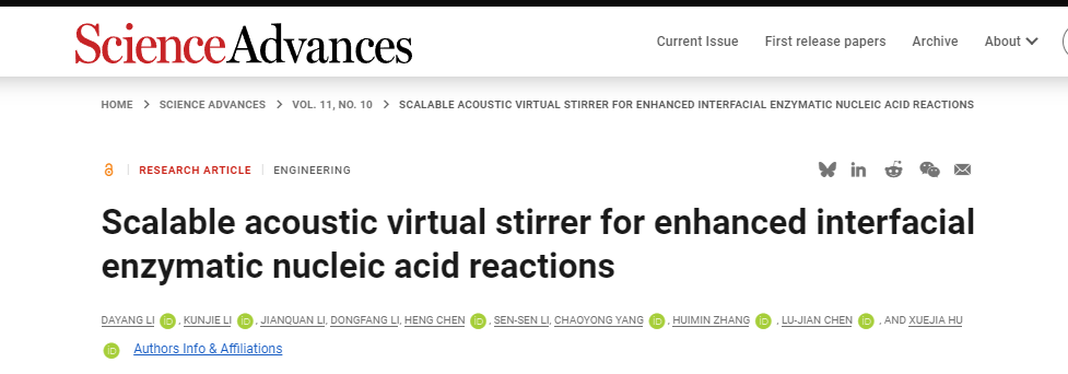 近日,嘉庚创新实验室张惠敏副研究员团队和厦门大学电子科学与技术学院胡学佳助理教授、陈鹭剑教授在声学微反应器件研究方面取得新进展。相关成果以“Scalable Acoustic Virtual Stirrer for Enhanced Interfacial Enzymatic Nucleic Acid Reactions”为题发表于Science Advances(DOI:10.1126/sciadv.adt6955)