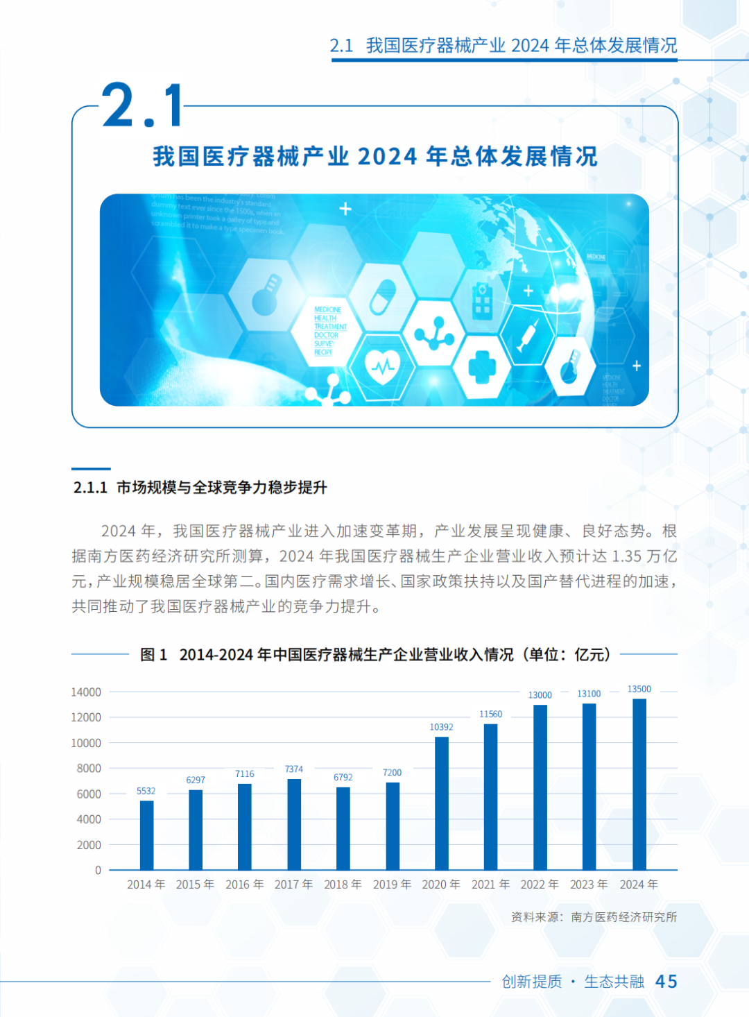 报告指出,2024年医疗器械行业在多重挑战中实现突破性发展:行业立法取得实质性进展,《医疗器械管理法》草案公开征求意见;创新产品审批数量和质量同步提升,多项技术达到国际先进水平;民族品牌加速全球化布局,构建国际竞争新优势。报告还指出,在政府引导、企业主体、科研支撑、临床应用协同发力下,我国高性能医疗器械产业必将实现更大跨越,为守护人民健康、建设现代化强国做出新的历史性贡献。