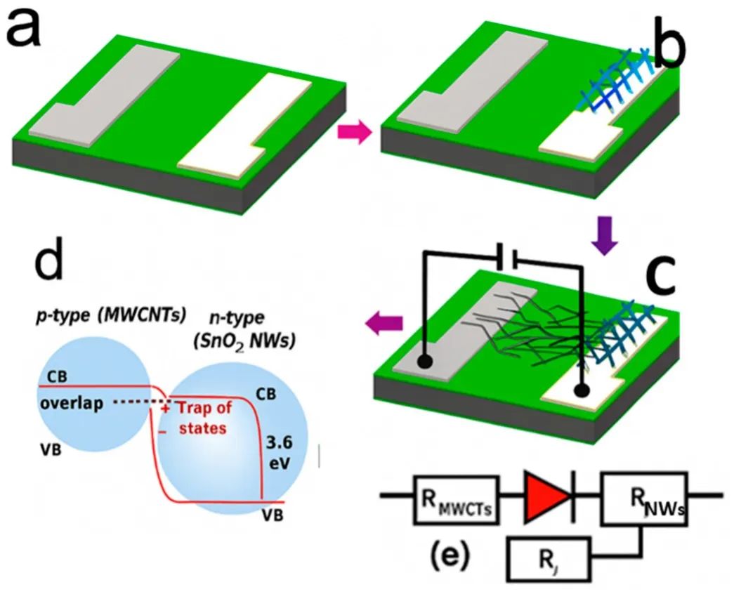 图6 MWCNT/SnO₂纳米线异质结传感器的制备工艺及其电子结构示意图