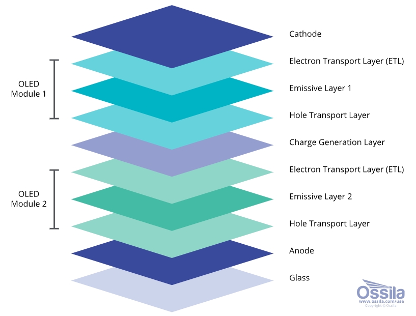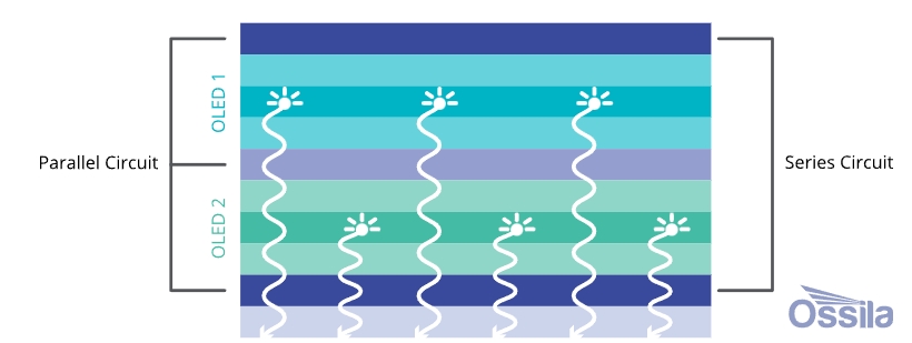 串联 OLED 屏幕结合了两个独立的 OLED 设备,也称为 OLED 模块。每个模块单独发光,在某些情况下,可以独立控制。串联 OLED 设备是两个堆叠的 OLED 设备连接到外部电路