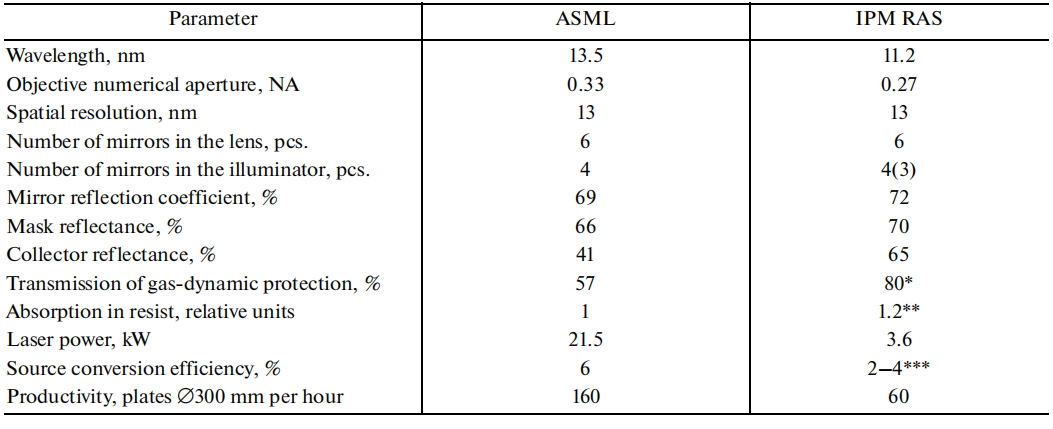 表1. TWINSCAN NXE:3600D光刻机主要参数与IPM RAS概念框架下开发的光刻机预期参数的比较