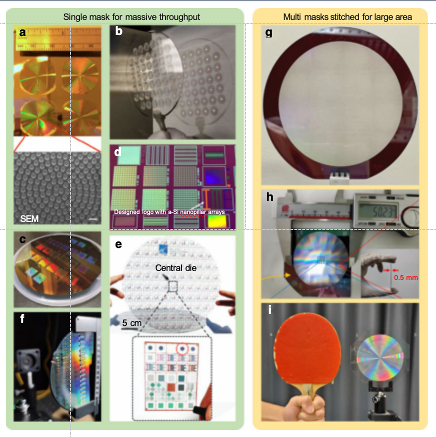 • 图1e:12英寸玻璃晶圆上制备的样品实物图,以及中心芯片实物图(高亮区域标注超构透镜位置)。