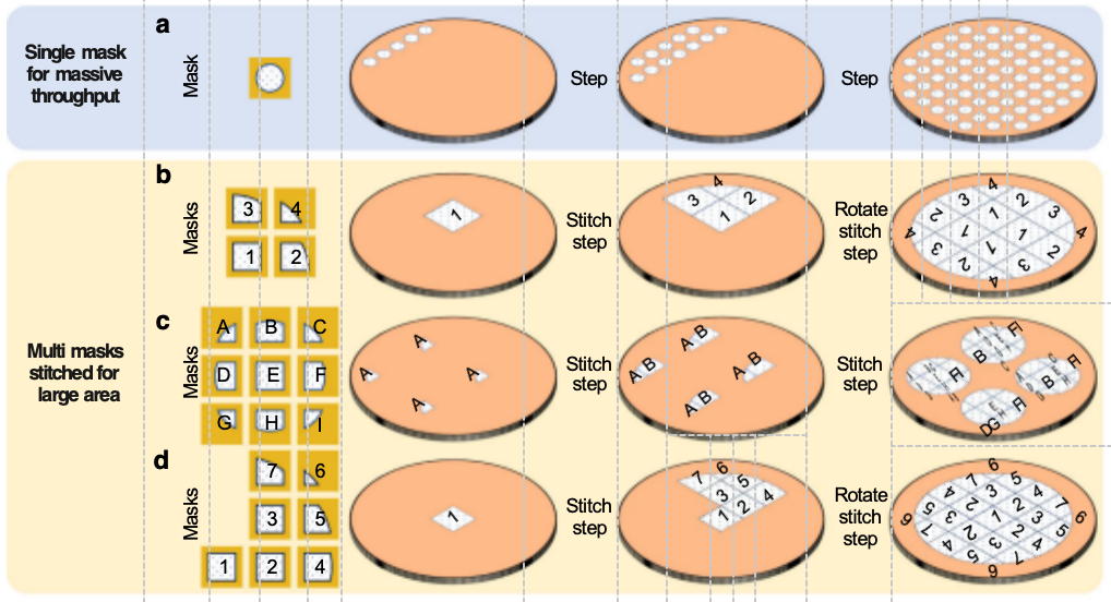 同样使用多个掩模,通过分步移动掩模并逐段拼接图案的方式,实现大面积超构透镜的图形化,可灵活调整拼接精度以适配不同尺寸需求。