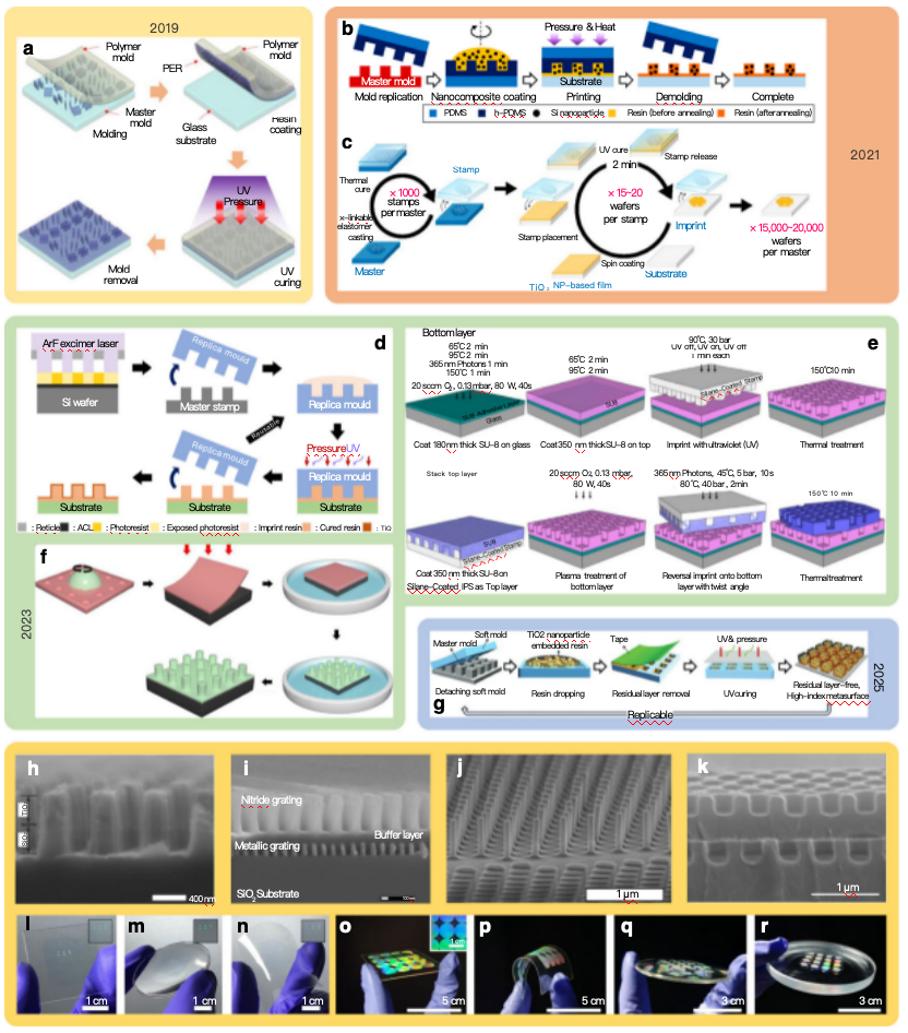 • Park等人[42]:用ArF步进光刻制备含266个超构表面的8英寸硅母版,复制h-PDMS模具;在模具上旋涂TiO₂ PER,倒扣于8英寸玻璃衬底,施压并加热转移后脱模,实现低成本、高吞吐量制造。
