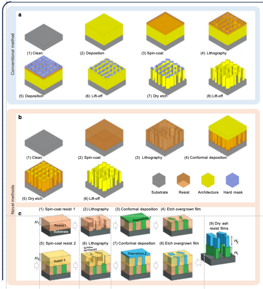 • 图4a:传统“自上而下”刻蚀法制造超构表面的流程示意图。该方法通常以电子束光刻(EBL)定义图案,需结合沉积、刻蚀、剥离等后续工艺。
