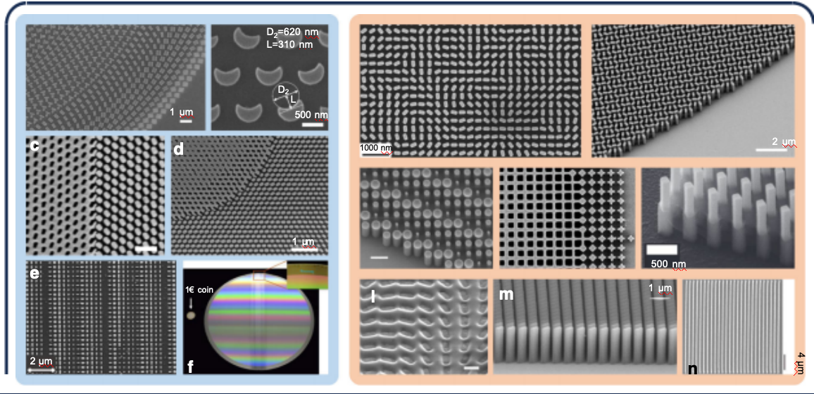 • Sin Tan等人(参考文献143):利用大面积超构表面开发经济型全介质多层防伪印刷工艺(基于SU-8光栅)。在Si衬底上旋涂并烘烤~650nm厚SU-8层→EBL图形化SU-8直接形成纳米结构→去除未图形化SU-8,11分钟内实现1mm²大面积印刷(抗蚀剂灵敏度高,特征尺寸~200nm)(图5n)。建议避免后烘烤,以减少残留层并防止热暴露导致的交联效应。