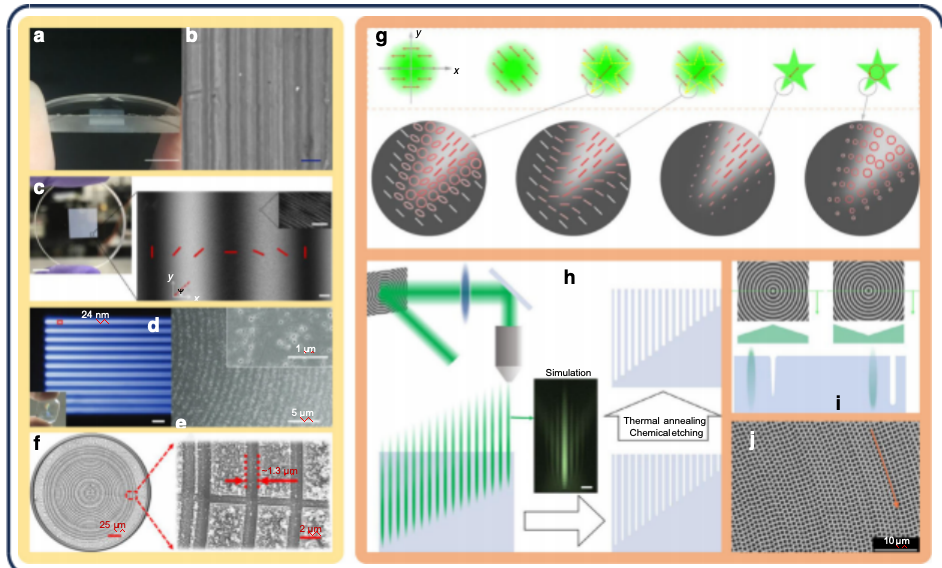 • 核心成果:制造含187亿个纳米结构的100mm直径全玻璃超构透镜,用于宇宙成像,通过旋转对称复用仅用7块掩模实现5×5网格(25个区域)的拼接(对应图2d,样品见图1i)。