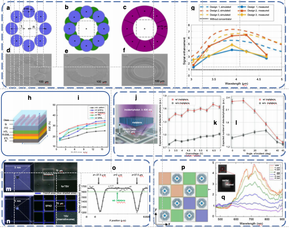 • 核心突破:针对传统中红外透镜孔径小、受温度影响大的问题,开发“多掩模联合步进光刻”技术,制备5cm大孔径超构透镜,用于热成像相机(对应图2c,样品见图1h)。