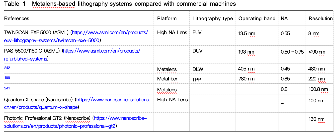 • 光刻技术:无需量产时,成熟光刻技术制造研究用超构透镜成本较低(半导体级精度,成本低于EBL)。但现有深紫外(DUV)光刻设备向研究市场普及需时间,且大面积多掩模超构透镜需突破高精度标记对准、图案边界重合与过渡等技术难点。