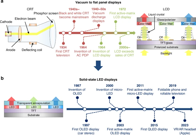 图1. 自发光显示技术的发展:a. CRT 和 LCD 的器件结构,以及从真空显示器向平面显示器过渡的时间线。b. LED 显示器的器件结构与时间线