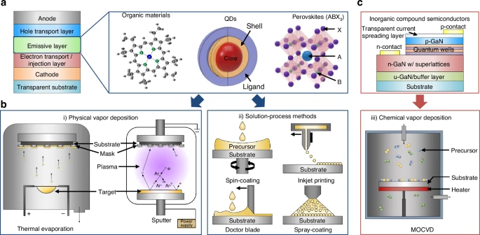 图 2. LED 的自发光材料:a. 用于 OLED、基于量子点的 LED 和 PeLED 的结构和发射材料。b. 发射材料沉积方法:有机材料、量子点、钙钛矿和无机化合物半导体。c. 微发光二极管 LED 的代表性结构