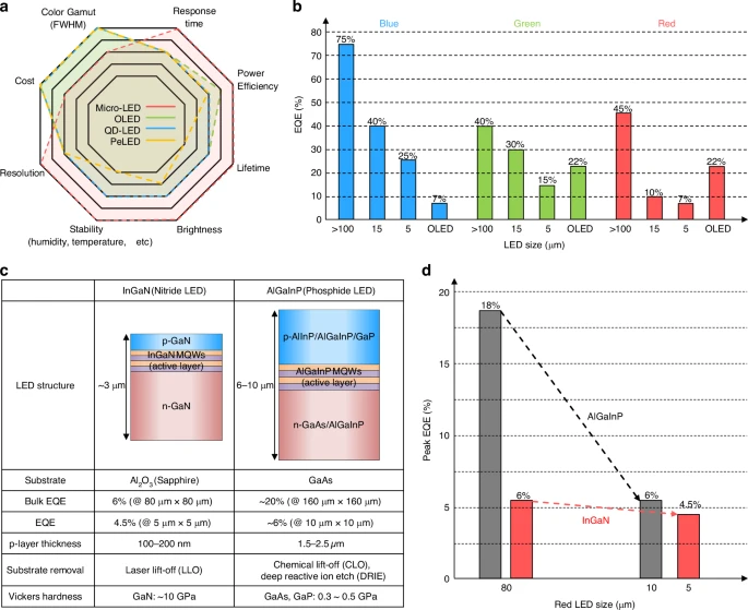 图 3. Micro-LED 中尺寸依赖效率损失:a. Micro-LED 与其他发光二极管 LED 的比较。b. 基于 LED 尺寸的 EQE 劣化。c. 基于 InGaN 和 AlGaInP 的红色 LED 特性。d. 基于 InGaN 和 AlGaInP 红光 LED 尺寸的 EQE 变体。
