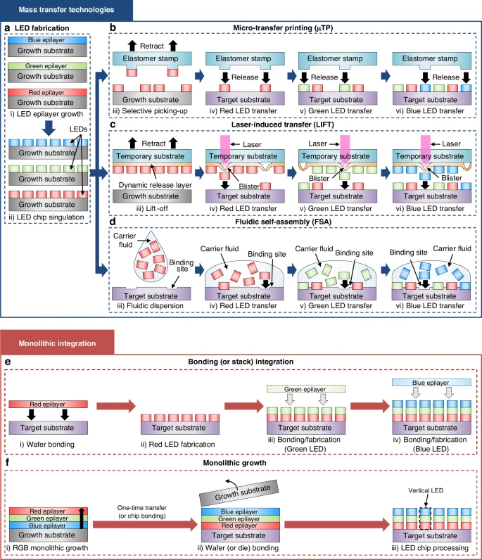 图 4. 传质与单体集成技术:a. LED 制造示意图。b. 弹性体印章转印工艺的示意图。c. 激光诱导转移的示意图。d. 流体自组装的示意图。e. RGB LED 层结合(或堆叠)集成的示意图。f. 整体增长的示意图。