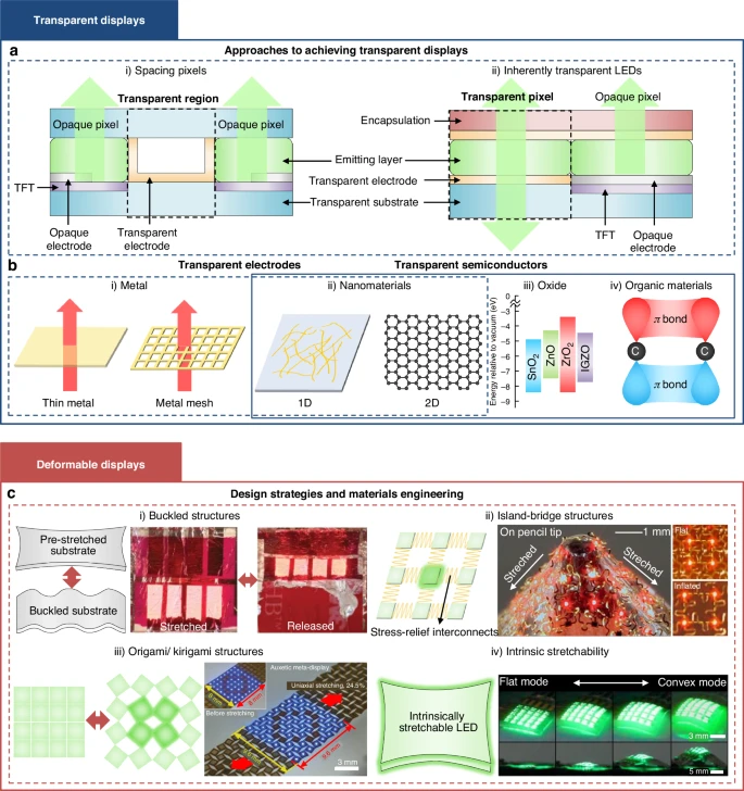 图 6. 新兴的显示应用:a. 实现透明显示的两种方法。b. 透明电极和半导体的示意图。c. 可变形显示的设计策略与材料工程。