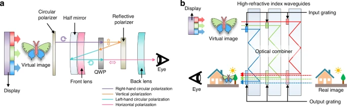 图 7. VR/AR 显示屏:a. VR 显示结构 。b. 带波导的增强现实显示器结构。