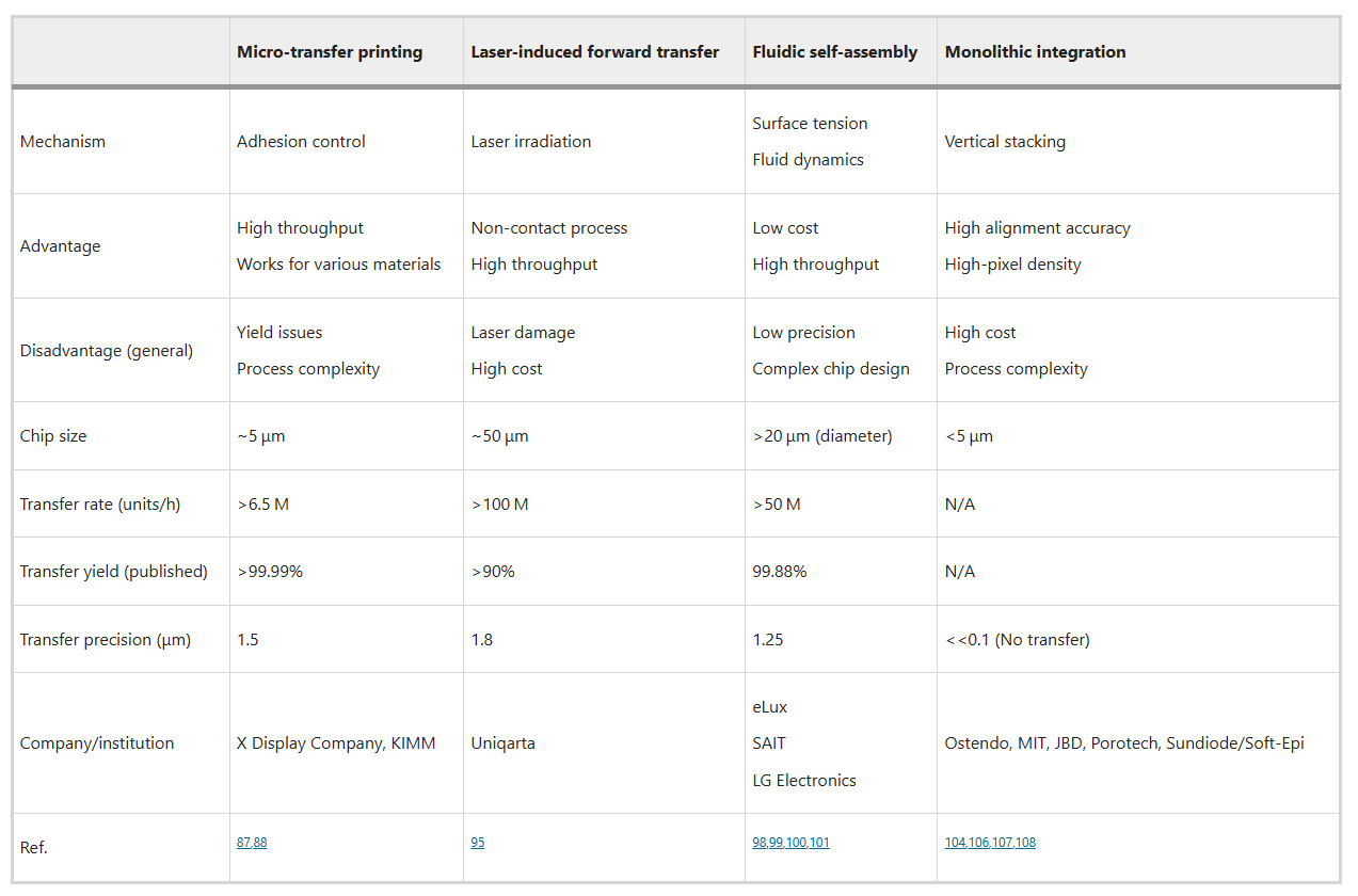 本节介绍了四种最广泛研究的传质方法的机制和特性:微转印、激光诱导前转、流体自组装和单片集成。它们的特性和关键参数(芯片大小、传输速率、良率和精度)也总结于表 1。