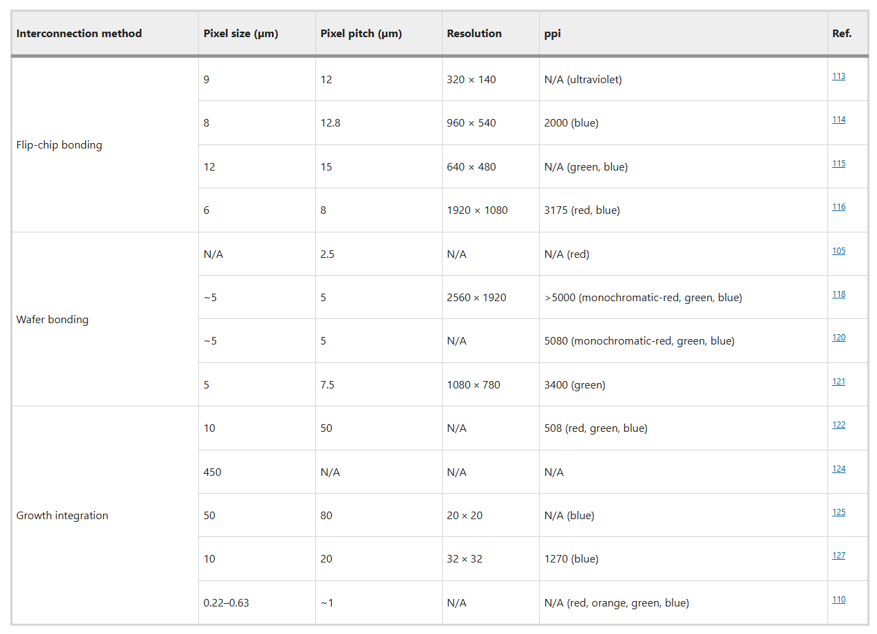 在质量转移过程之后,Micro-LED 必须与显示背板电气互联,该背板由晶体管和电容电路组成,能够控制单个子像素的亮度和开关状态。对于 OLED 显示器来说,这一过程很简单,因为 RGB 子像素可以直接沉积在背板的触点板上。微 LED 显示器需要不同的处理方式,因为无机 LED 的高生长温度可能会损坏 CMOS 电路。目前,大型Micro-LED 显示器采用翻转芯片键合,而微显示器则依赖晶圆键合。另一种方法是生长集成,即 TFT 在 LED 晶圆上生长并整体连接。表 2 提供了这些方法的比较。