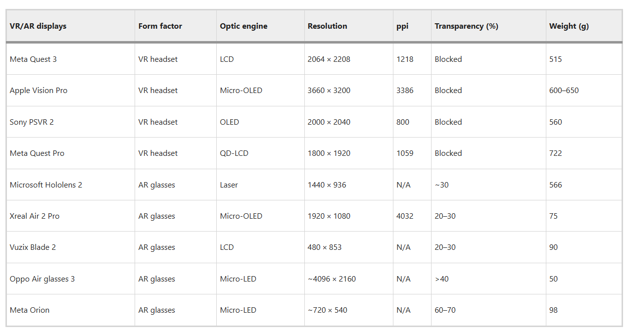 表格3:商用VR/AR显示产品关键参数对比基准表
