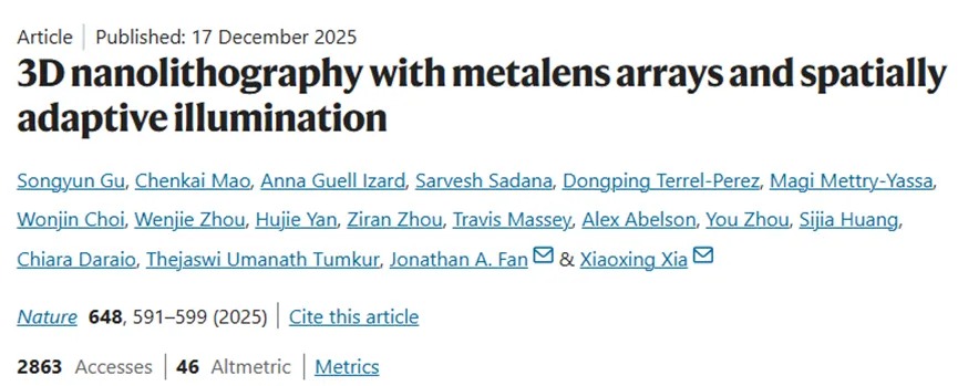 近日,国际顶尖学术期刊《Nature》正式刊发了一项在增材制造领域取得突破性进展的研究论文——3D nanolithography with metalens arrays and spatially adaptive illumination (Nature2025, 648, 591-599)。该研究由美国劳伦斯利弗莫尔国家实验室与斯坦福大学等机构合作完成,展示了一种能够实现厘米尺度、纳米精度、高通量三维制造的新一代光刻平台。本研究的关键组成部分之一,是采用了滨松公司的空间光调制器(LCOS-SLM,型号 X15213-02R),其卓越的性能为研究的成功提供了坚实保障。