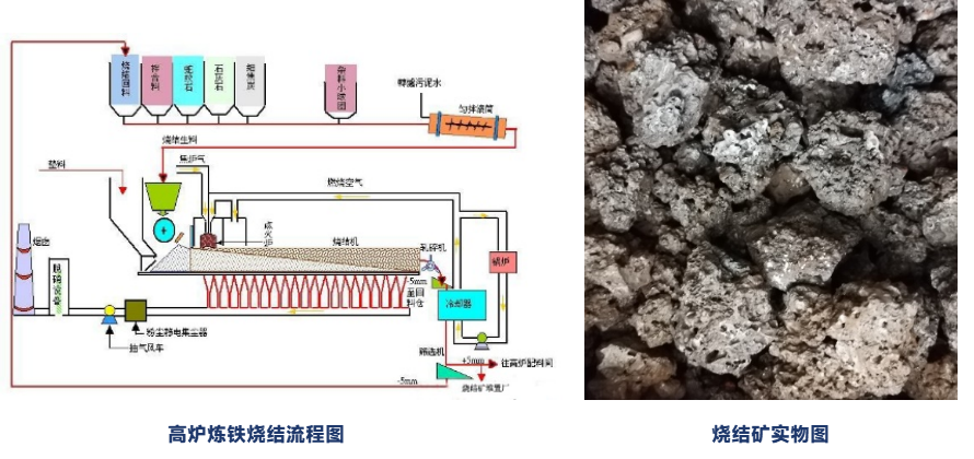 铁矿粉粒度太小,透气性差,且容易导致炼铁高炉崩料,因此通常制成烧结矿后再投入高炉炼铁。烧结矿粒度较大,且为多孔结构,强度也比较大,可以保证高炉的顺利运行。烧结是将各种粉状含铁原料,配入适量的燃料和熔剂,加入适量的水,经混合和造球后在烧结设备上使物料发生一系列物理化学变化,将矿粉颗粒黏结成块的过程。