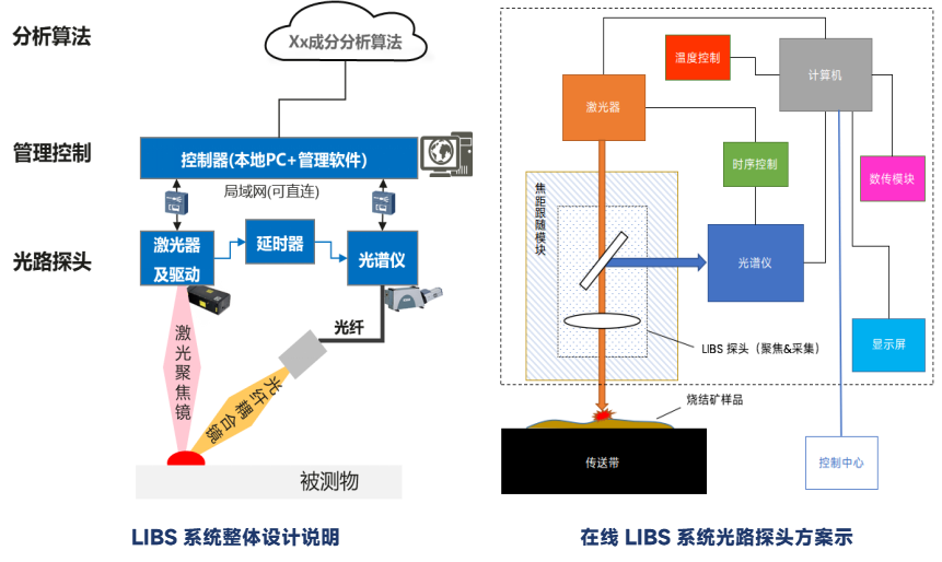 莱森光学工业在线LIBS激光诱导击穿光谱仪由光路探头(在线LIBS系统光谱采集)、管理控制、分析算法三部分组成,应用于高炉炼铁前的烧结矿环节,在线实时检测烧结矿的相关成分,获取烧结矿的重要参数(品位和碱度)适时调整配比以控制产量。