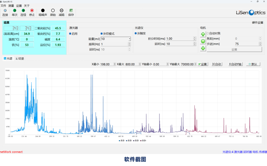 (2) 可实时显示LIBS光谱曲线、保存和导出光谱数据、上传最终分析结果(Fe、CaO、SiO2含量)。