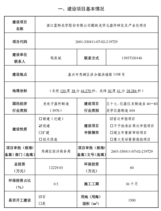 【新建项目】浙江蓝特光学股份有限公司微纳光学元器件研发及产业化项目