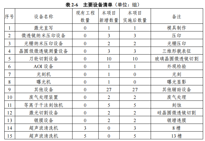 本项目总投资金额为12,229.03万元,无新增厂房建设,改造装修公司现有厂房(包括超净房建设等);引进购置一批:激光切割机、微透镜纳米压印机、光栅纳米压印机、刀轮切割机、AOI检测设备、等离子干法刻蚀机等设备60台(套),将光学玻璃、硅透镜等原材料采用半导体技术、纳米压印、刻蚀技术即涂覆压印胶,模具校准,对准与压印,紫外固化、脱模、去胶、镀膜、切割、检测测试等先进半导体光学加工工艺量产,最终得到产品晶圆级压印微透镜阵列和晶圆级刻蚀微透镜阵列,实现微纳光学元器件相关产品技术迭代与创新升级,最终形成年产晶圆级压印微透镜阵列280万颗、晶圆级刻蚀微透镜阵列9000万颗。